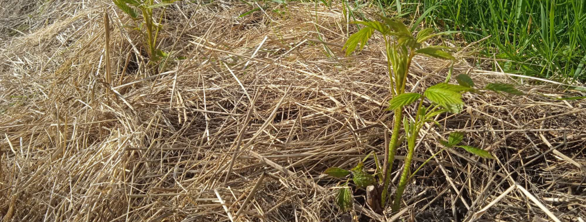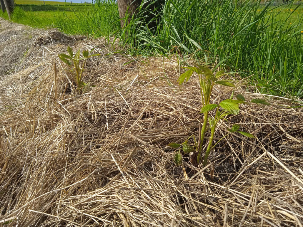 Das kühle und feuchte Frühjahr bot sich an, um noch neue Beerensträucher zu pflanzen. Im Spätsommer erhalten Rote und Schwarze Johannisbeeren sowie Jockelbeeren immer ihren Rückschnitt. Das anfallende Schnittgut habe ich für die Stecklingsvermehrung genutzt. Dazu werden etwa 5-10 cm lange Zweigstücke in Erde gesteckt. An einem etwas geschützten Platz im Garten haben sie über den Winter kleine neue Wurzeln gebildet und konnten jetzt direkt eingepflanzt werden. Mittlerweile treiben sie schon neue Blätter aus und werden hoffentlich ab nächstem Jahr auch Früchte tragen. Dann gibt es im Sommer öfter auch mal eine Beerenmischung in die Gemüsekiste. Außerdem wird leckere Marmelade daraus gekocht. Auch die Himbeerreihe wurde erweitert. Die vorhandene Hecke hat nämlich reichlich neue Triebe gebildet, die nun ordnungsgemäß in Reihe verpflanzt wurden. Eine gute Portion Heu mulcht die Beerenhecke und schützt vor Austrocknung, Wind und schneller Verunkrautung.