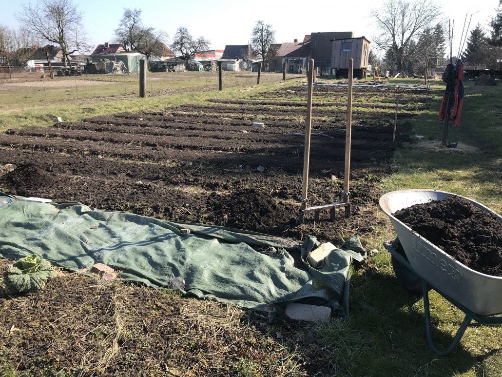 In den letzten Wochen habe ich die Beete für die neuen Aussaaten fit gemacht. Das heißt, altes Gemüse entfernt, wie z.B. Rosenkohl und Wirsing. Der strenge Frost um die Weihnachtstage von minus 15°C und darunter hatte sie dahingerafft. Danach einmal mit der Doppelgrabegabel den Boden gelockert und zu guter letzt eine Portion Kompost auf die Beete verteilt. Die allzu verunkrauteten Beete wurden mit Folie abgedeckt. Darunter wird dies gleich zu Humus umgesetzt. Sehr praktisch. Dann kamen diese und letzte Woche auch schon die ersten Samen in die Erde: u.a. Möhren, Wurzelpetersilie, Radieschen und Spinat. Da es im gesamten März noch keinen einzigen Tropfen Regen gab und auch keiner in Sicht ist, entschied ich, zu bewässern, damit die Saat überhaupt keimt.